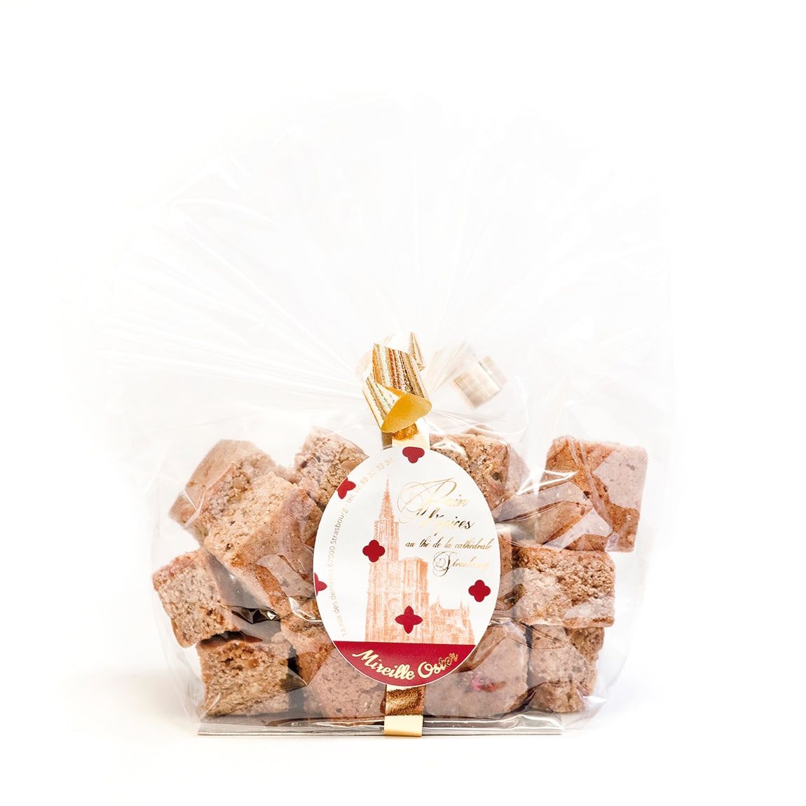 Country-style flour from the Hurtigheim Mill, Arbousier honey, ground hazelnuts, Erstein sugar, All-Gäu butter, candied oranges, pink peppercorns, candied cherries, Dammann Cathedral Tea, cinnamon, cloves, mace, ginger, cardamom, aniseed, pepper, icing sugar with Cathedral Tea.